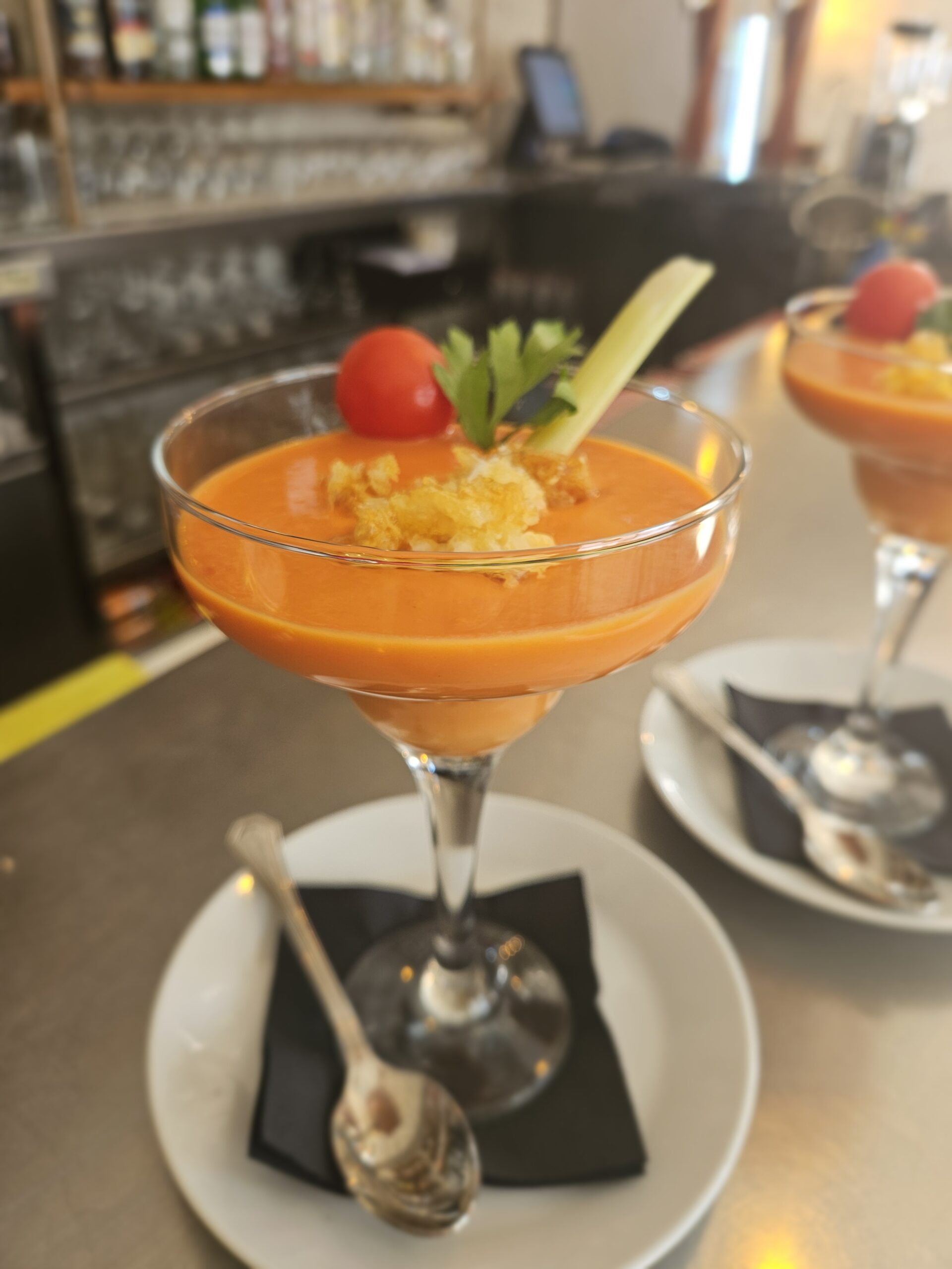 | Option with Pata Negra ham + € 4.50 Tuna tataki with avacado salad Thai salad with crispy egg Option with grilled prawns € 4.50) Beef skewwers with Pancette and tarragon maynonaise Salmorejo (chilled tomato soup) Bouilabaisse with various types of fish and rouille | €12.50 €12.50 € 7.50 €13.50 |